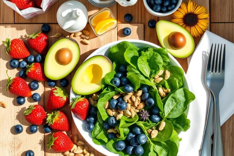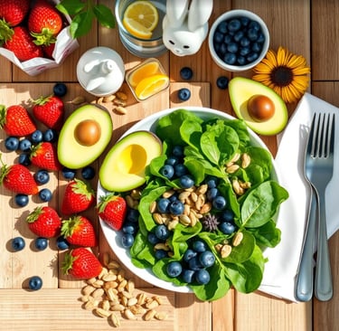 Em tempos em que a rotina é acelerada e o autocuidado acaba ficando em segundo plano, dedicar um momento para alimentar-se de forma equilibrada se transforma em um verdadeiro gesto de amor-próprio. A imagem acima traduz essa ideia com cores intensas e elementos naturais: frutas frescas como morangos e mirtilos, folhas verdes vibrantes, abacates e sementes — uma combinação que une sabor, nutrição e beleza.
